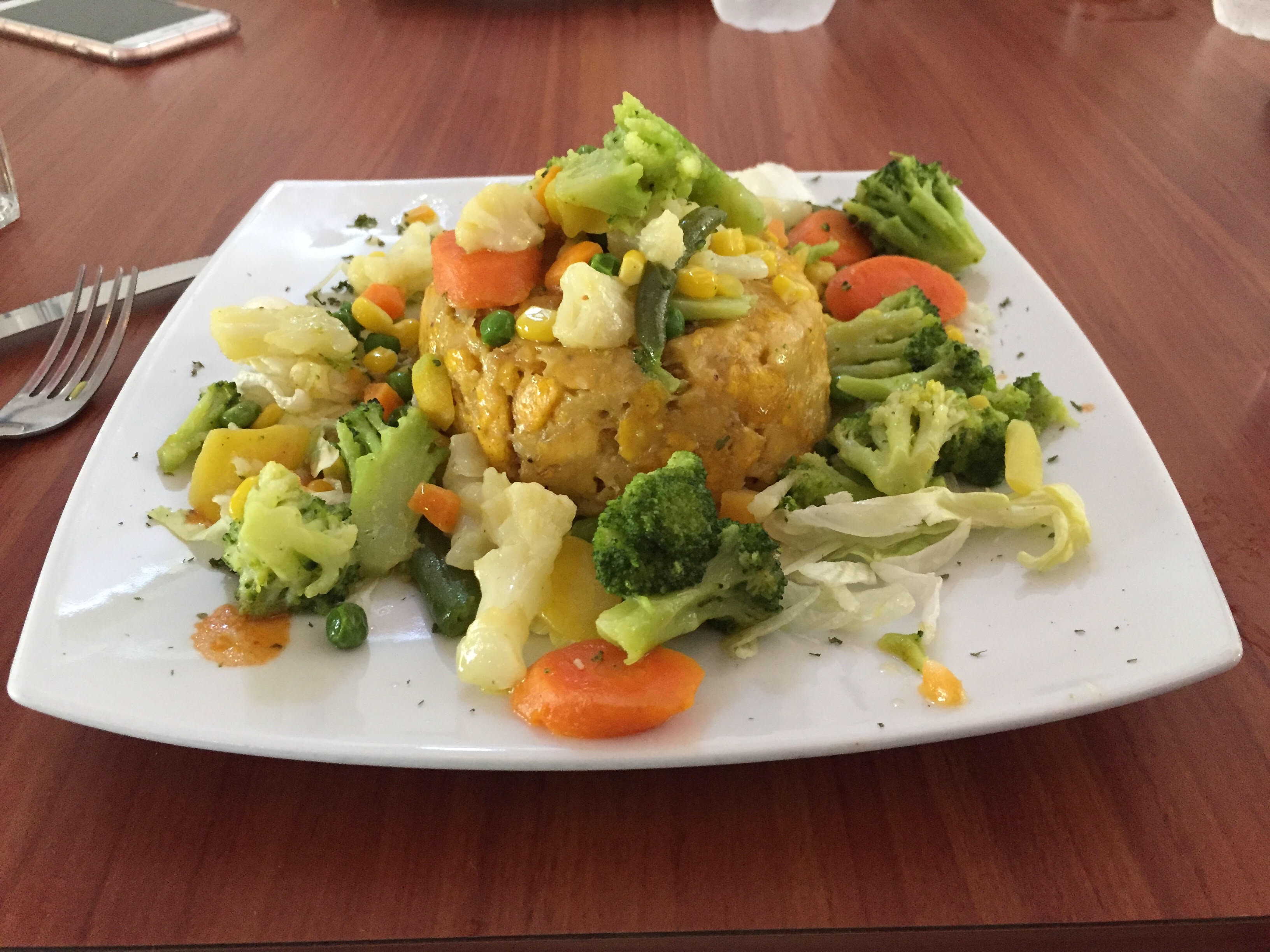 We headed to Fajardo and had lunch at one of the many small restaurants along a strip of water. The water was behind us and the restaurant (#22, sorry I don’t have a name for you) was fantastic. So far, everyone has been more than happy to accommodate my dietary needs. This place was no exception. We ate mofongo, a traditional food made out of the green plantain. Unlike the ripe version, green plantains are not sweet so they make for wonderful, savory dish additions. A mofongo is made when they cook the plantain, mash it and then fry it. Everyone else got some sort of meat on theirs. Rich and I asked for vegetables, and they came up with an amazing treat. Tons of fresh veggies, including cauliflower, broccoli, carrots, peas, beans, and corn in a garlic sauce that was just delicious.